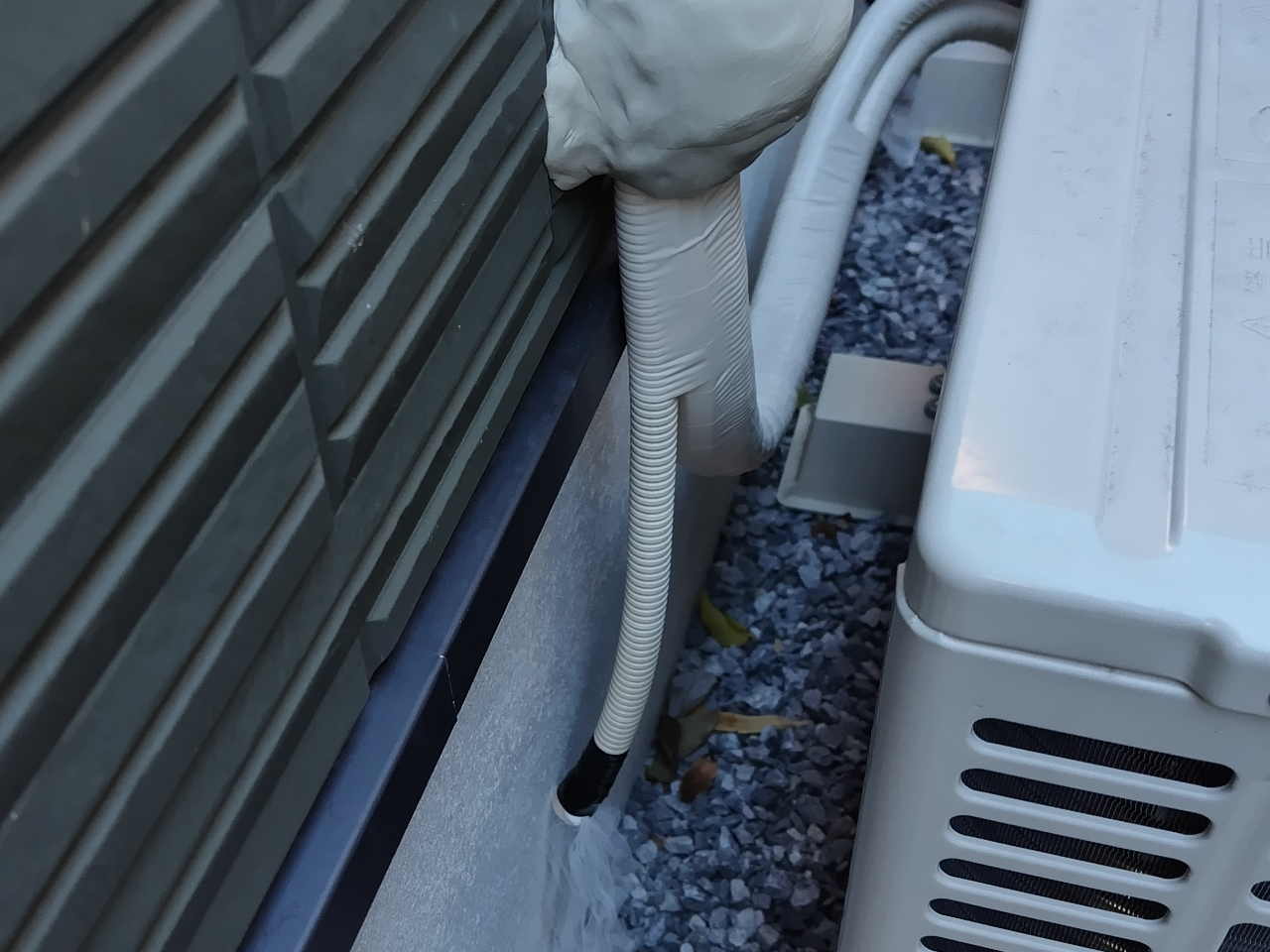 白っぽくてギザギザしてる柔らかい管が多くあるタイプで、たまに塩ビ管のものもあります。